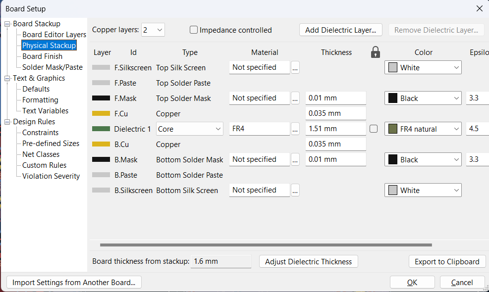 Closed Source My Kicad Board Setup Settings Published Dec 2023 · 1 min read KiCad Board Setup PCB Board Stackup - Physical stackup Board Stackup - Board Finish Board Stackup - Solder Mask/Paste Text & Graphics - Defaults Design Rules - Constraints Design Rules - Pre-defined Sizes